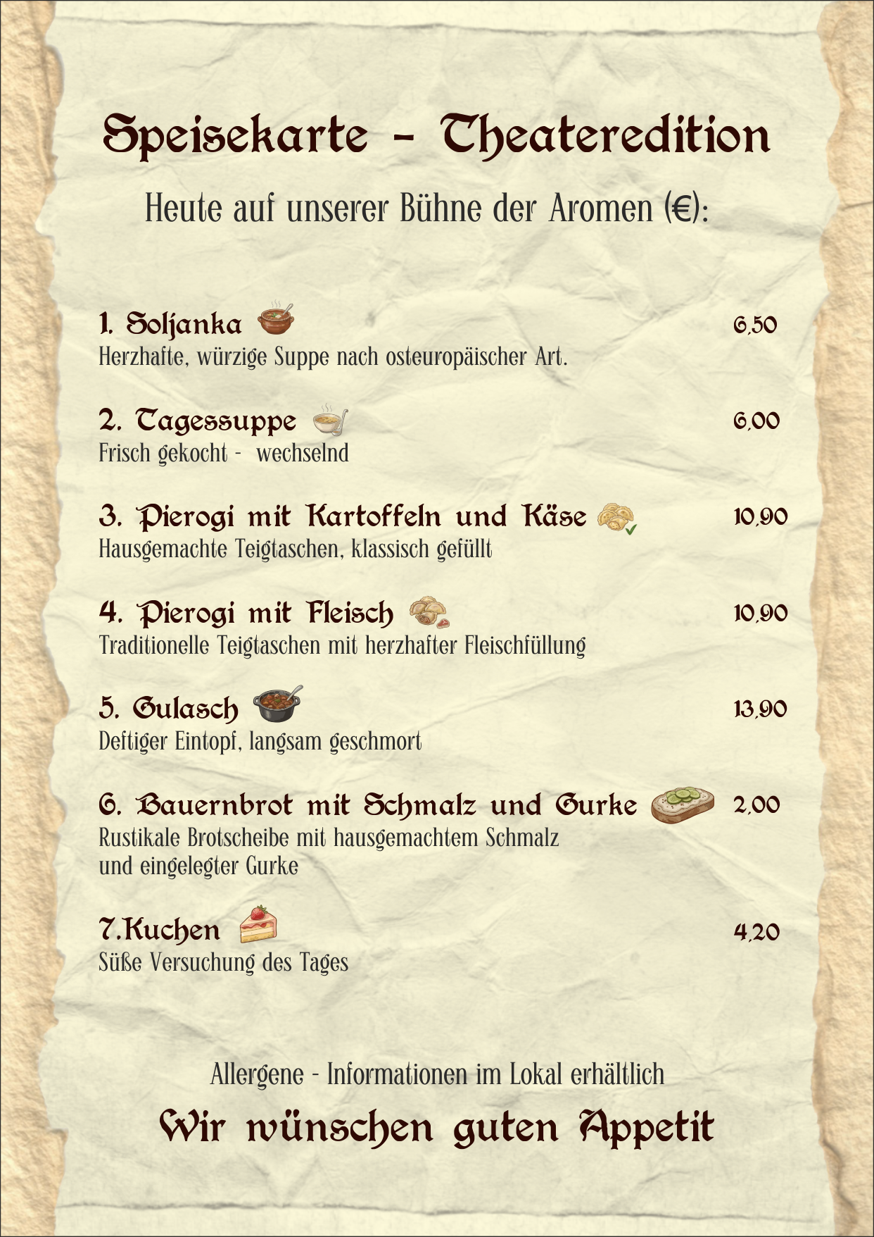 In der neuen Saison übernimmt die polnische Gastronomin Joanna Golab mit ihrem Team unsere Theatergastronomie. Die Kleine Wirtschaft bietet vor und nach den Vorstellungen hausgemachte polnische und deutsche Spezialitäten wie Piroggen, Gulasch, Soljanka und vegetarische Suppen sowie selbstgebackenen Kuchen an.